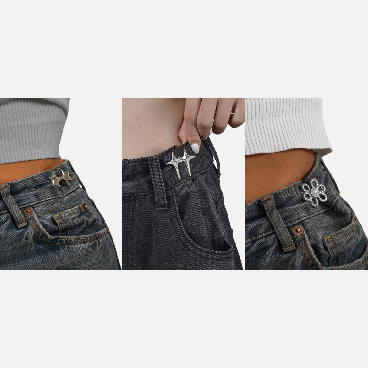 Lunahs midjejusterare fästs direkt i linningen och drar in midjan till önskad passform. Ingen sömnad, inga permanenta ingrepp och inget bälte behövs. Den kan tas bort när du vill utan att lämna märken.